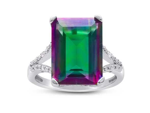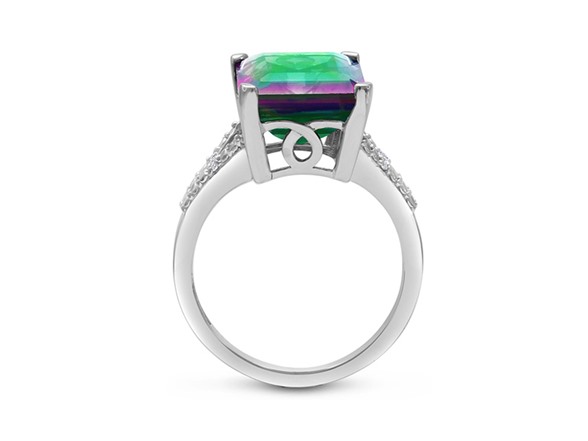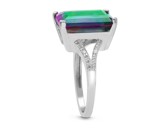 This huge 10ct emerald shape mystic topaz and diamond ring in sterling silver features an enormous rainbow amethyst accented by diamonds in J-K color and I1-I2 clarity. This ring is especially unique because it features a split shank on the band. The total weight of the mystic topazt is 10ct and the diamond weight is 0.02ct. Total gem weight is 10.02ct. Gem measures 14x10mm.