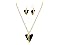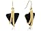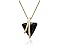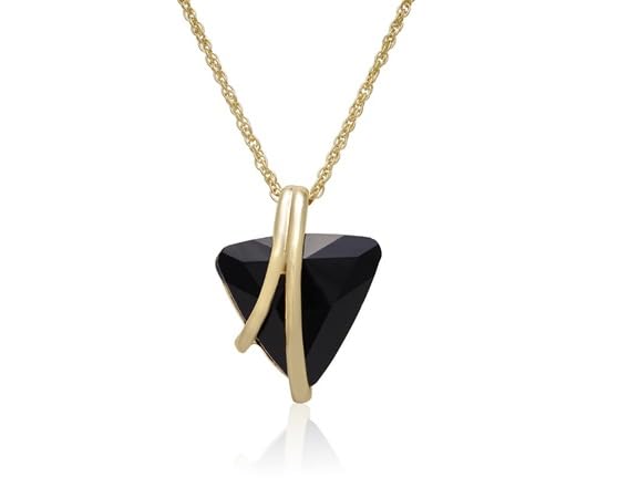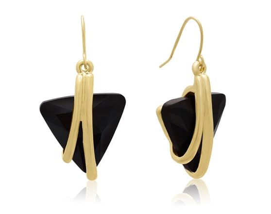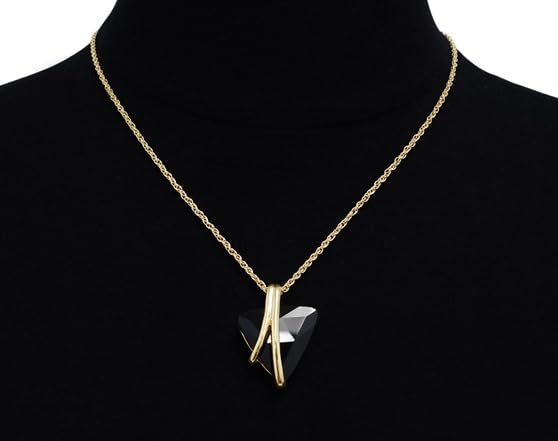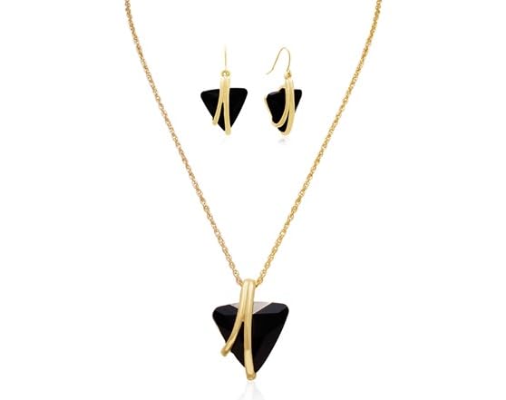 This necklace features 1 huge trillion shape crystal black onyx measuring 1 inch, in a unique gold setting. It has an 18 inch cable chain with lobster claw clasp. Necklace comes with a free pair of matching earrings. Each earring contains a 3/4 inch trillion shape crystal black onyx in the gold setting. Each earring dangles down 1 1/2 inches and has secure fishhook backs. Jewelry set is crafted in gold plated brass.