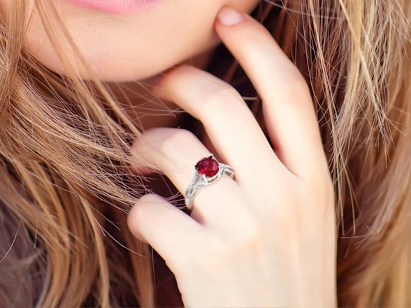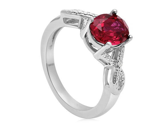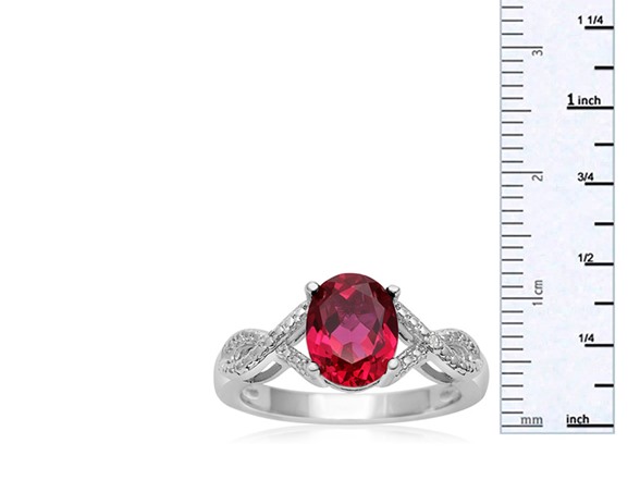 This beautiful ring features one 9x7mm oval shape created ruby gemstone at 2.60 carats. It is surrounded by ribbons of sparkling diamonds on the shank in J-K color, I1-I2 clarity, at 0.01 carats. Total gem weight is 2.61 carats. This ring is crafted in platinum overlay.