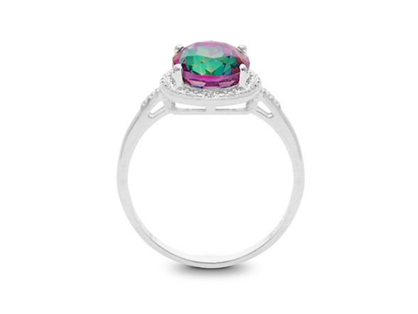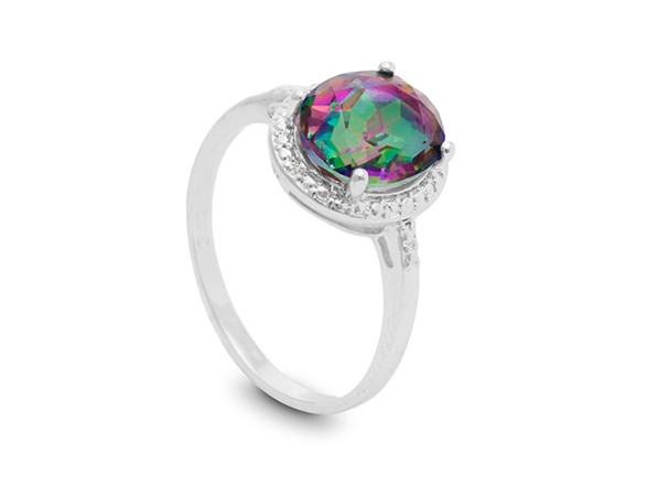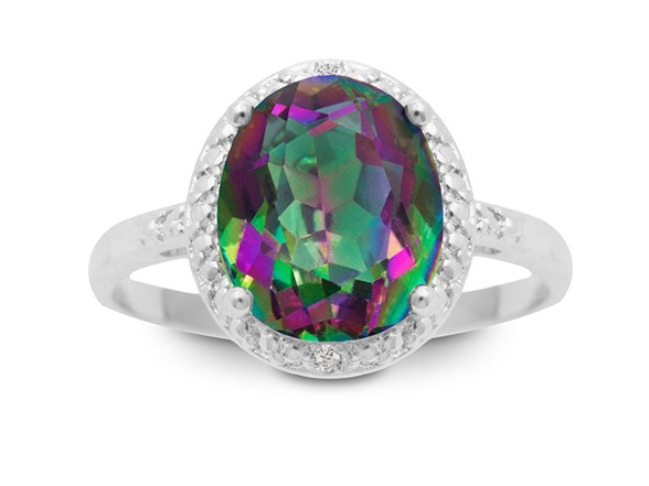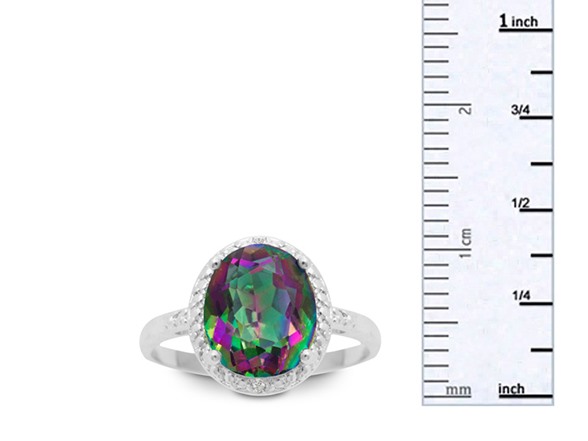 This ring features one 8x10mm oval shape mystic topaz gemstone at 2.80 carats. It is surrounded by sparkling diamonds in J-K color, I1-I2 clarity at 0.01 carats. Total gem weight is 2.81 carats. This ring is crafted in platinum plated brass.