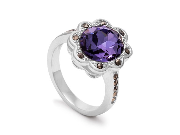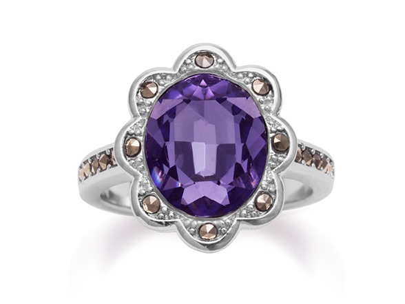 This stunning ring features an incredible 12x10mm crystal tanzanite gemstone. It is surrounded by a halo of marcasite stones. The ring has the look of a 4 carat gemstone ring. Ring is crafted in platinum plated brass and ring top measures 16x14mm.