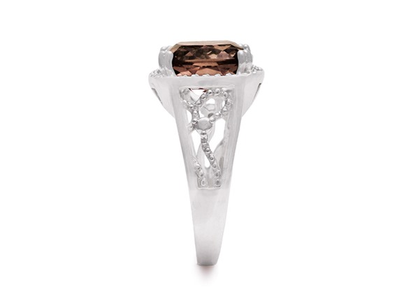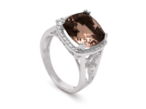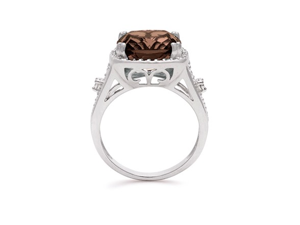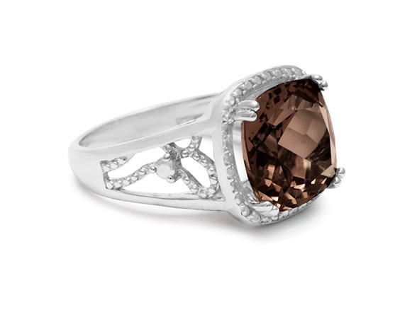 This 5 1/3ct cushion cut smoky quartz ring is perfect for all occasions. You will feel so special in this ring, as it shines beautifully in the light. This ring is especially unique because it has a halo style around the center gemstone, and it has an antique style band. The ring is crafted in solid sterling silver. Ring top measures 11x11mm.