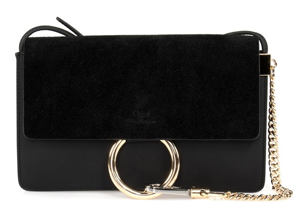 This Chloe Faye Shoulder Bag in size small combines both smooth and suede colored calfskin which provides both texture and depth. This 1970's inspired bag is delineated by the pale gold toned piercing ring loop with a hook and chain. Faye's elegant unique raw edges gives it a sophisticated rectangular appearance as it can be carried either tucked under the arm or hung gracefully from the shoulder. The bag features one roomy interior compartment and two additional compartments one internal flat pocket top stitched front flap with magnet closure and an adjustable leather strap. This sensational bag incorporates an opulent mix of pale gold and silver toned hardware and features a suede calfskin interior lining. Measuring 9 W (24cm) x 6.3" H (16cm) x 3.5" D (9cm) with a minimum strap length of 20.1" (51cm) and a maximum strap length of 22.4" (57cm). This item ships with a dust bag and designer's documents."