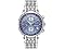 - Round watch featuring textured blue dial with stick indices, three chronograph subdials, and magnified date window at 4 o'clock