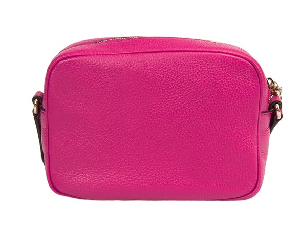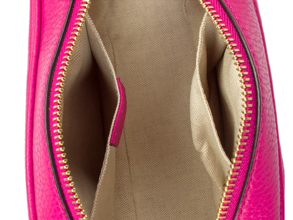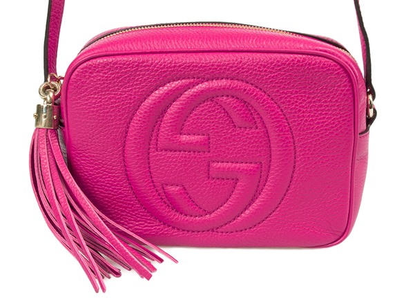 Although compact in size this fuchsia Gucci Disco Bag makes a big and bold statement. Expertly crafted in Italy utilizing high quality luxurious textured leather this elegant bag features a top zippered closure leather tassel light gold hardware and gorgeous branding consisting of the embossed interlocking two Gs". The interior is adequately equipped with phone and open pockets and a natural cotton linen lining. For versatility this bag comes with an adjustable leather strap with a 21.7" (55cm) drop. The bag measures 8.3" (21cm) W x 5.9" (15cm) H x 2.8" (7cm) D and ships with documentation."
