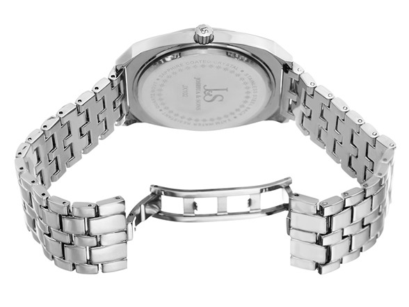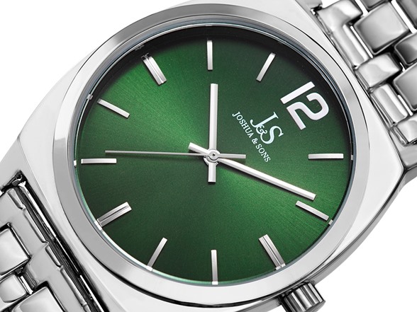 This impressive Joshua & Sons timepiece showcases a 27mm tonneau-shaped case with a beautiful stainless steel finish and a green dial adorned with striking silver tone markers. It is powered by a highly accurate and reliable Miyota quartz movement, which utilizes a classic three-hand indication. This watch comes adorned with a five row stainless steel link bracelet.