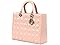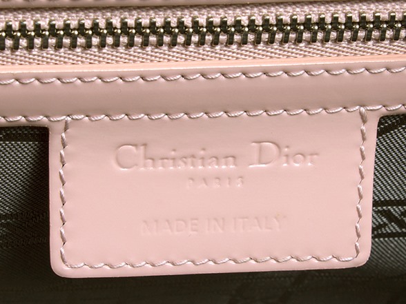 A bona fide work of art, this pink Lady Dior Bag is meticulously handcrafted utilizing high quality patent leather. The bag's timeless look consists of Dior's signature motif, the cannage stitching, which is an elaborate network of diagonal and perpendicular stitching which creates cushions of quilted leather. The seductive arched handle, silver zipper closure, shiny silver toned hardware and jewelry charms (including four "DIOR" letters hanging from one handle) magnificently conspire to create an accessory of unsurpassed elegance. The bag has a classy patterned dark tan interior fabric lining. Additional organizing space is provided by an inner pouch which is secured with a zipper closure. This bag comes in size Large and measures 12.5in (31.7cm) wide by 10in (25.4cm) high by 4in (10.2cm) deep. This iconic accessory comes complete with a shoulder strap and dust bag.