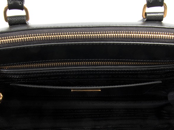 This black Prada BN2274 NZV F0002 bag is constructed from high quality saffiano leather. It features double zip compartments hanging key ring side snaps and metal lettering logo on leather triangle. In addition the double rolled handles with 5' drop removable/adjustable shoulder strap with 23.5 drop and gold tone hardware make this tote a must have. Other features include exterior pockets with top zip closure interior flat pockets and protective bottom feet. Measuring 13" wide x 9.75" high x 6" depth this item ships with a dust bag and designer's documents."
