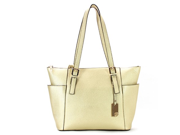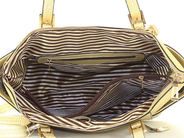 A must have accessory that is all the rave this season, the Khloe Tote is your perfect large tote to turn heads everywhere you go while also providing you with unlimited versatility. Handcrafted with luxurious pebbled animal friendly vegan leather, light gold hardware accents, and a removable shoulder strap. Outwardly the beautiful structured design along with the modern buckle detail allows for a classy look and two roomy side pockets for maximum functionality. That's not all, peek inside to find beautifully designed luxury pinstriped interior fabric lining with many zippered pockets and compartments for all your necessities! Carry this bag as a tote with the dual top handles or utilize the removable and adjustable shoulder strap for added convenience and comfort!