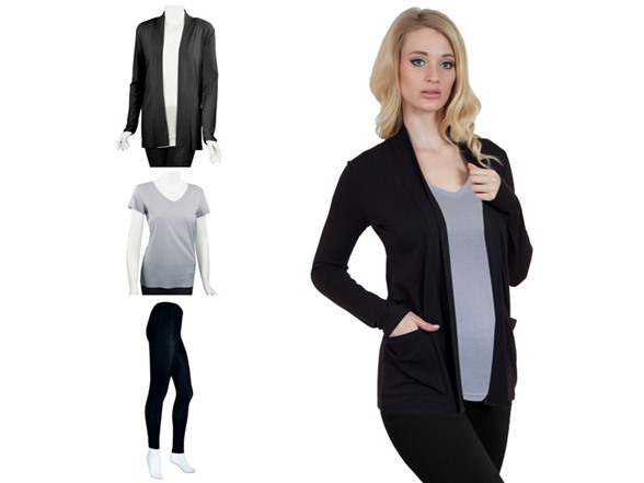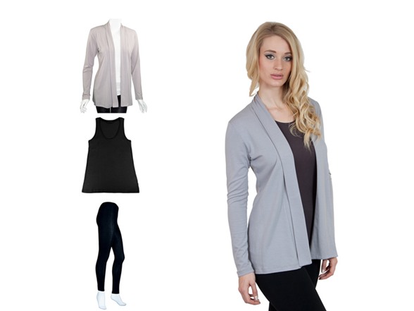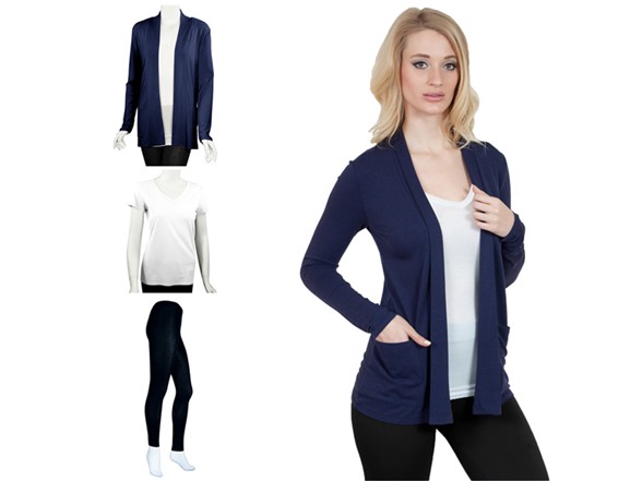 - All include: (1) Open front cardigan, (1) Flowing Tank OR Short Sleeve V-Neck, (1) Fleece Legging OR Standard Legging