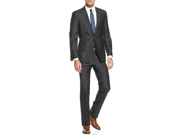 2pc Slim Fit Suit: Notch Lapel, 2 button closure, fully lined, double side vents, unhemmed Flat Front pants