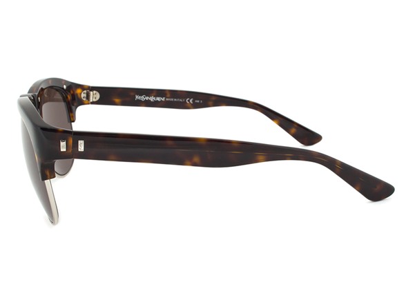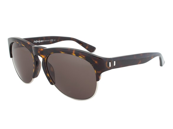 The aviator sunglass style is one which has been reinvented many times, with numerous designers taking a crack at them. These Yves Saint Laurent YSL 2353 sunglasses are well constructed utilizing a dark Havana single bridged semi-rimmed frame, which acts as a solid foundation for the brown lenses. Miniature rectangular silver toned branding inserts add a minimalist touch of flair to this model. Measuring 56-17-135, this item ships with its own distinctive case, lens cleaning cloth and manufacturer's documentation.